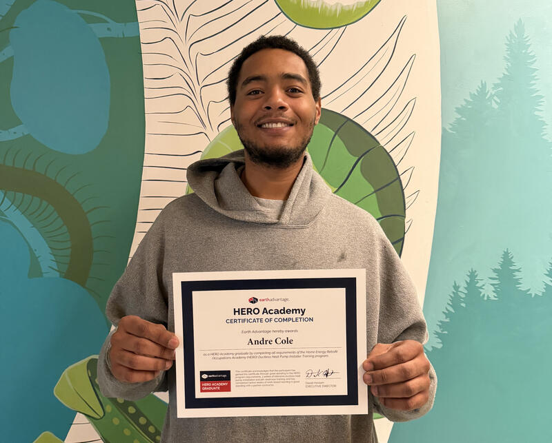 Andre Cole grew up in Portland and graduated from Jefferson High School. After finishing his pre-apprenticeship training with Constructing Hope in Winter 2024, he found an interest in exploring residential construction trades. Andre successfully completed the first cohort of Earth Advantage’s HERO Academy, specializing in Ductless Heat Pump Installation in January 2026! He is currently looking for an entry-level position in heat pump installation in the Portland area, while looking into completing relevant certifications. If your company is currently hiring, please contact him via email.