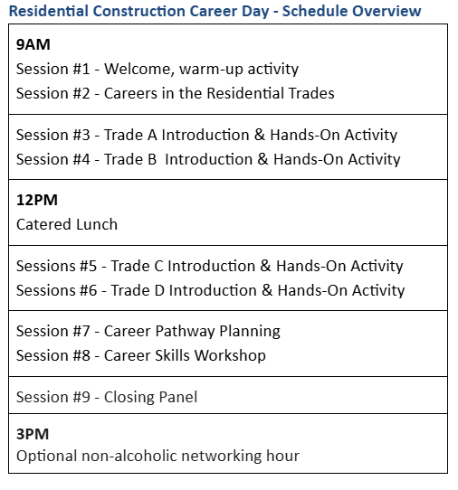 Come join us at the Residential Construction Career Day, where the next generation of emerging residential construction professionals can learn about careers in the sustainable trades, connect with industry leaders, access career support and scholarships, and learn how to apply for upcoming training program opportunities.